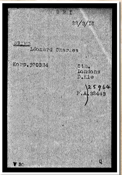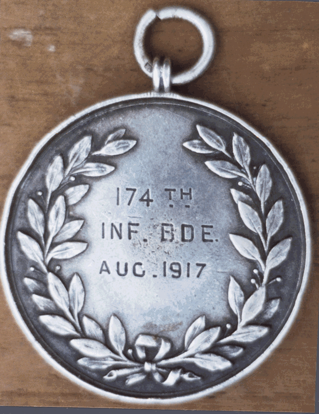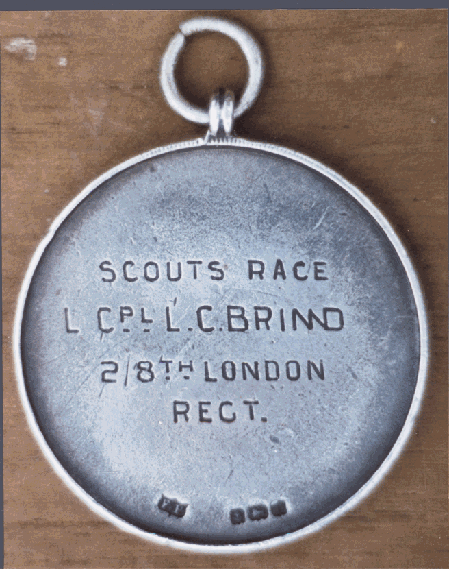 Leonard Charles was awarded several medals, "For voluntary service overseas 1914-19, territorial war medal", which is inscribed "1823 Priv L C Brind 8 London R", and "Great War for Civilisation, 1914-19" "1823 Cpl L C Brind 8/London. R". These were the usual campaign medals. More telling is a silver medal inscribed: "174th Inf Bde, Scouts Race, Lance Cpl L C Brind 2/8 London. Regt." This race happened in August 1917. A second copper or bronze medal says "174th Inf. Bde Cross Country Sutton Veny 1916". | |||