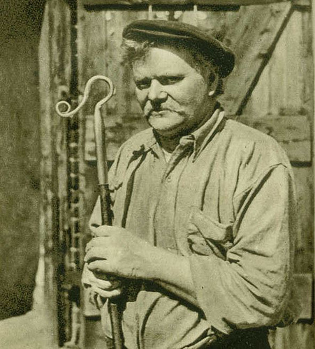 This picture is the crookmaker of Pyecombe from H V Morton's I Saw Two Englands (1939). Morton said this was an England that had almost passed - a relic of life before the First World War. "The head of the crook is of iron or steel, and nothing makes a better crook than an old gun barrel. The haft of the crook must be formed of unpeeled hazel for the shepherds will not have ash. They polish the hazel until it looks like mahogany. "As the purpose of a crook is to catch a sheep by the leg, and as the various breeds of sheep in England vary in size, there are many patterns. A Sussex crook would be of no use to a Kent shepherd, and a man herding Dorset Horns would require still a different pattern. . . "Pyecombe crooks last more than a lifetime, but as there are fewer shepherds than ever on the Downs, there is not much genuine demand for them today. Instead the Mitchell brothers are generally busy making crooks for bishops and hikers." (pages 111-112) Pyecombe is probably in Sussex.  |