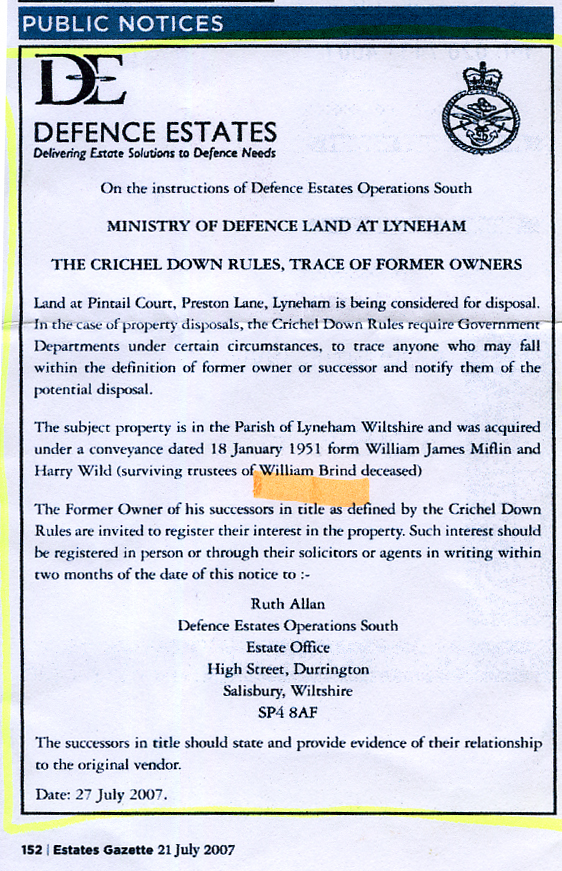 DEFENCE ESTATES Delivering Estate Solutions to Defence Needs On the instructions of Defence Estates Operations South MINISTRY OF DEFENCE LAND AT LYNEHAM THE CRICHEL DOWN RULES, TRACE OF FORMER OWNERS Land at Pintail Court, Preston Lane, Lyneham is being considered for disposal.In the case of property disposals, the Crichel Down Rules require GovernmentDepartments under certain circumstances, to trace anyone who may fallwithin the definition of former owner or successor and notify them of thepotential disposal. The subject property is in the Parish of Lyneham Wiltshire and was acquiredunder a conveyance dated 18 January 1951 from William James Miflin andHarry Wild (surviving trustees of William Brind deceased) The Former Owner of his successors in title as defined by the Crichel DownRules are invited to register their interest in the property. Such interest shouldbe registered in person or through their solicitors or agents in writing withintwo months of the date of this notice to ;- Ruth Allan Defence Estates Operations South Estates Office High Street, Durrington Salisbury, Wiltshire SP4 8AF The successors in title should state and provide evidence of their relationshipto the original vendor. Date: 27 July 2007. 152 Estates Gazette 21 July 2007 |