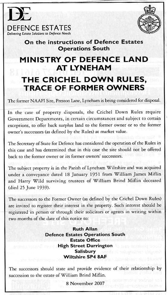 | On November 6, 2007 Defence Estates advertised again, this time using the correct name: William Brind Miflin. | ![]() |