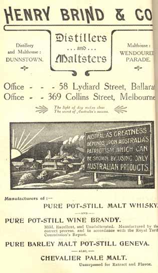 In 1864 he married Hester Bennett Goodfellow (1836 - 1878) by whom he had seven children - 4 boys and 3 girls. In 1881 he married Caroline Ann Thomas (1856 - 1945) by whom he had 2 boys. Henry Brind's whiskey and gin distillery was established in 1862 as Henry Brind and Co. It was at Dunnstown six kilometres from Ballarat. He was then managing director of the Wendouree Parade Distillery and eventually became sole owner of the Warrenheip Distillery. Henry Brind had numerous interests in public affairs. These included: a member of the visiting committee of the Reformatory; vice-president of the Ballarat Crickiet Club; vice-president of the Chemists' and Druggists' Cricket Club; vict-resident of Christ Church Gymnasium; one of the originators and trustees of the Central Bowling Club; was the vicar's warden at Christ Church; member of Bishop in Council and Church Assembly. |