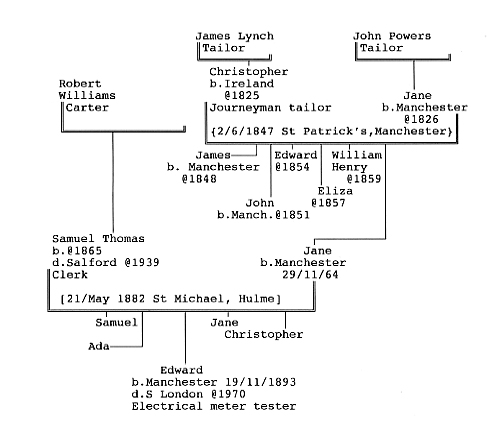 The wedding of Samuel Thomas Williams, who was born in Liverpool, and Jane Lynch, aged 17, took place at St Michael, Hulme, a Church of England Parish Church on May 21, 1882. Samuel gave his age as 19 (though he was probably 16 or 17). He said he worked as a Clerk. His witness was James Williams (brother, uncle?) and he said his father Robert Williams, a carter, was dead. Nine years later the couple were living in a two up, two down house at 29 Arthur Street, Hulme, with children Christopher (6), James (4) and Ada (1). Samuel was working as Clerk in the Dyeworks and according to the census he was younger than his wife. He was 25 and she 26. Poor little James was suffering from 'Water on Brain', according to the 1891 census. Edward Williams, my grandfather, was born on November 19, 1893. The family were still living at 29 Arthur Street but Samuel Thomas may have gone up in the world. At any rate he had a fancier job title. He was described as a 'Commercial Clerk'. Jane Williams, who according to family legend had bright red hair and spoke with a broad Irish accent, probably died in the early 1930s aged about 65. Edward Williams my grandfather, was a Meter repair tester. His health was never very good after the First World War. He had a struggle keeping himself on his feet to go to work.  |