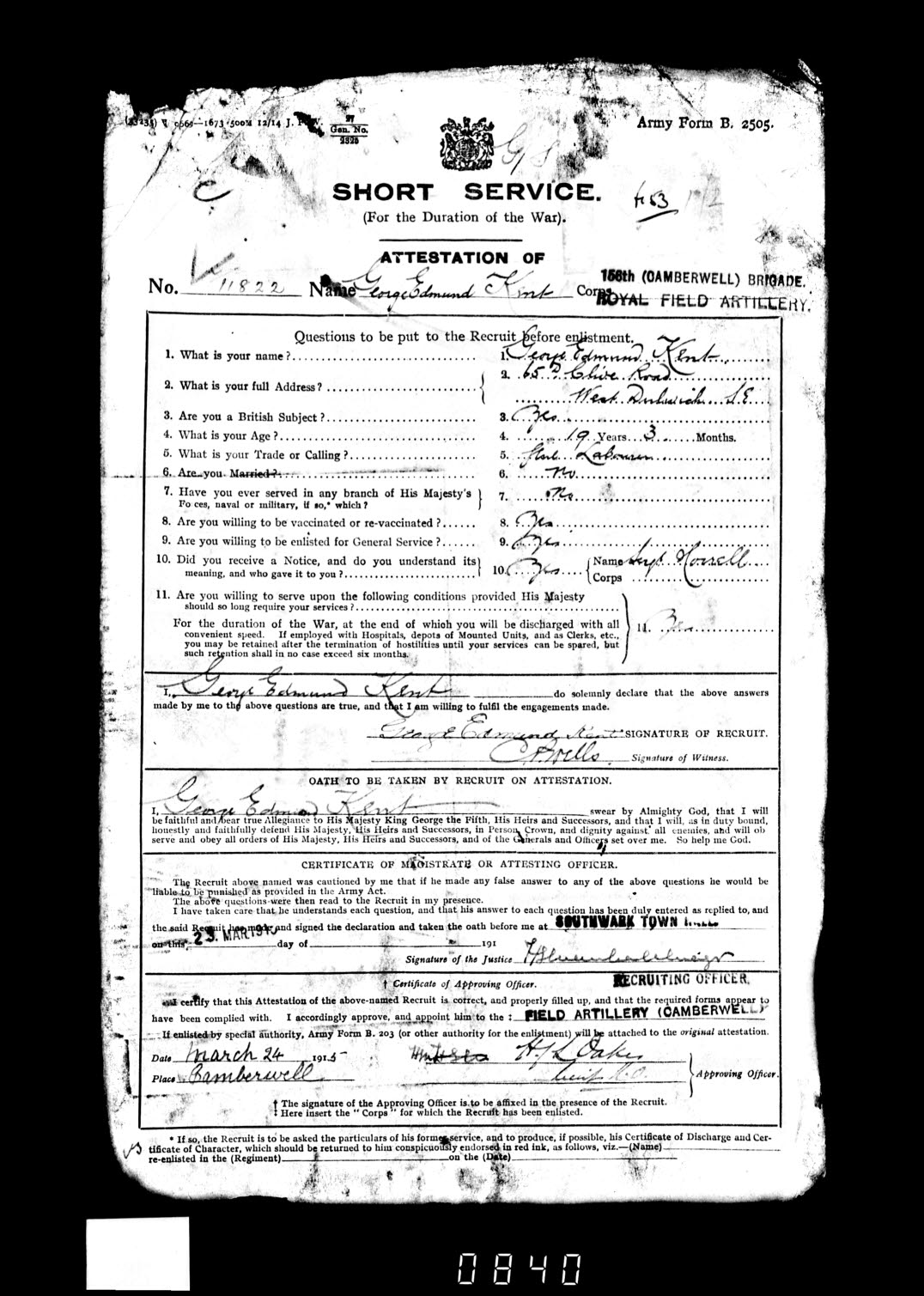 (For the Duration of the War). No L/11822 156th (Camberwell) Brigade Royal Field Artillery George Edmund Kent |