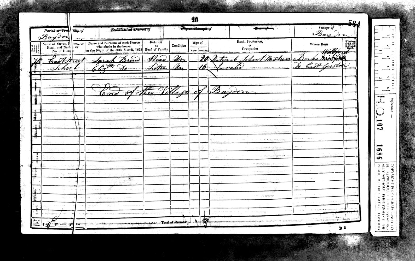 | Sarah Brind | 20 | Head | National School Mistress | Welsford, Berkshire |