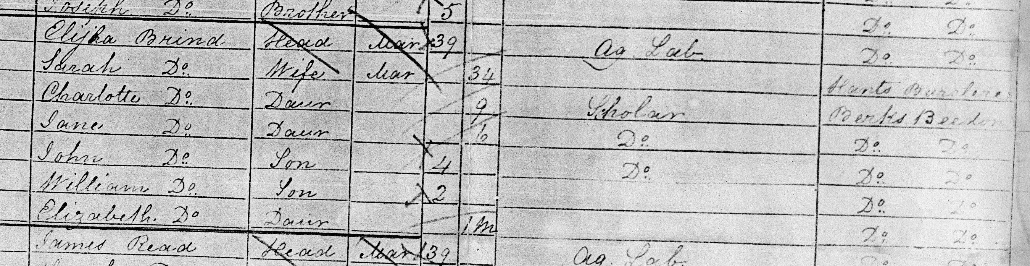| Jane Brind | 6 | daughter | Scholar | Beedon, Berkshire |