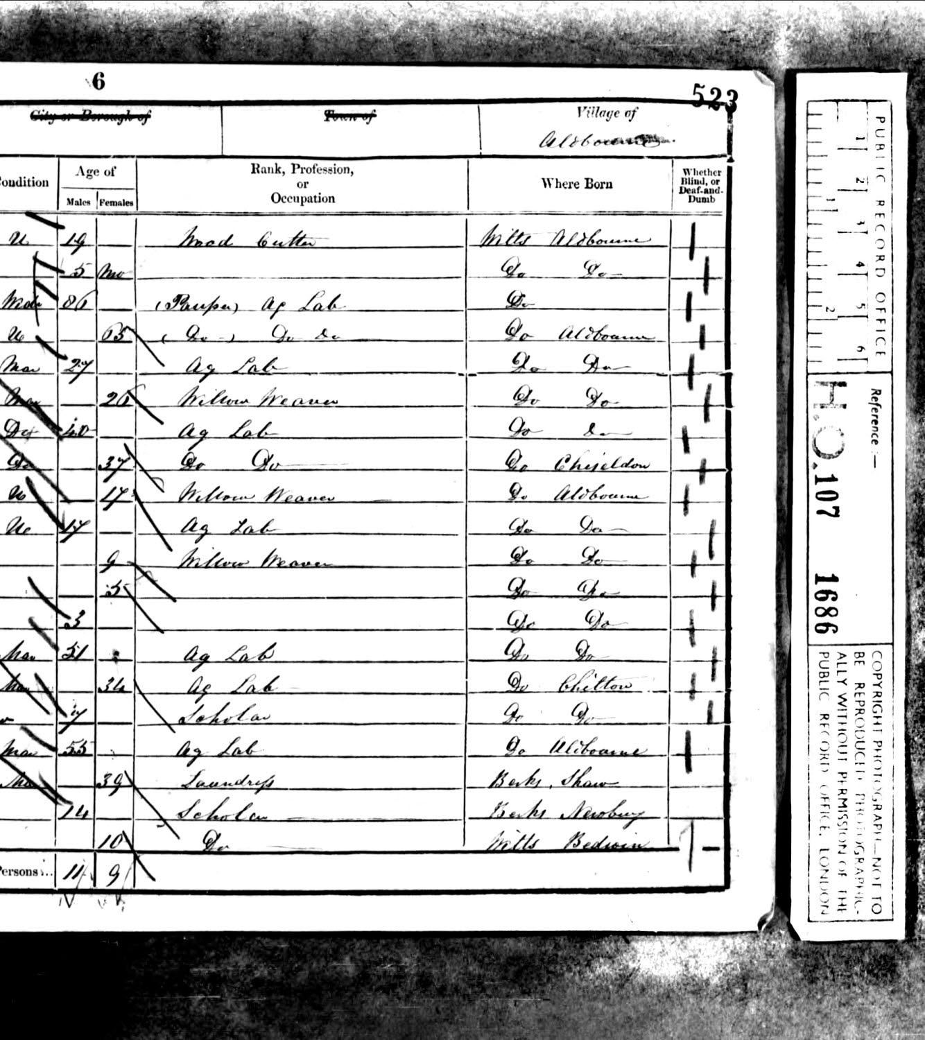 Aldbourn, Hungerford, Kintbury, Wiltshire> Class: HO107; Piece: 1686; Folio: 523; Page: 6; GSU roll: 193594.