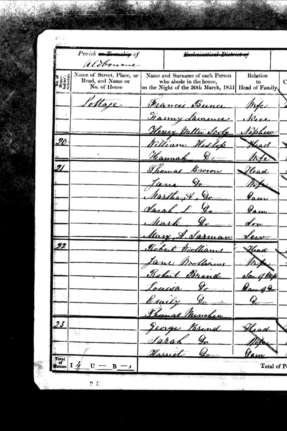 | Edward Brind | son | u | 19 | Wood cutter | Aldbourn, Wiltshire |