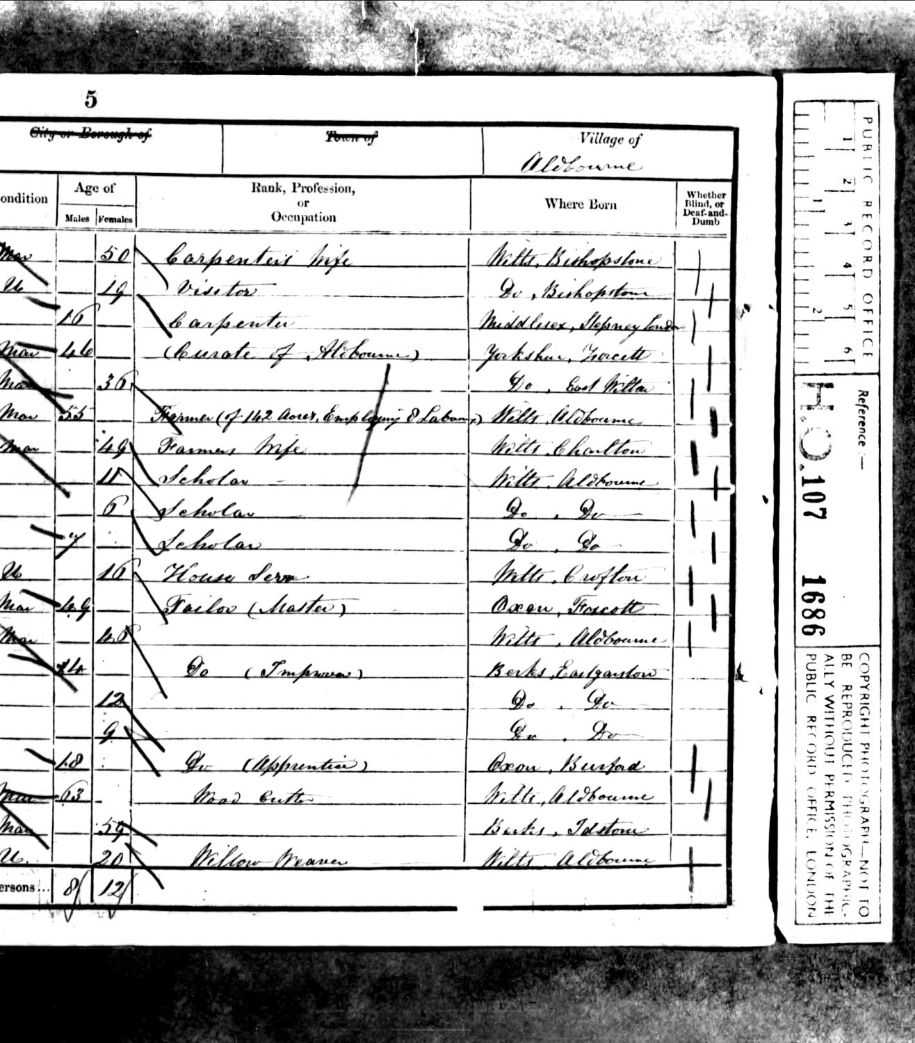 | Jane Woolliams | wife | mar | 46 | | Aldbourne, Wilts |