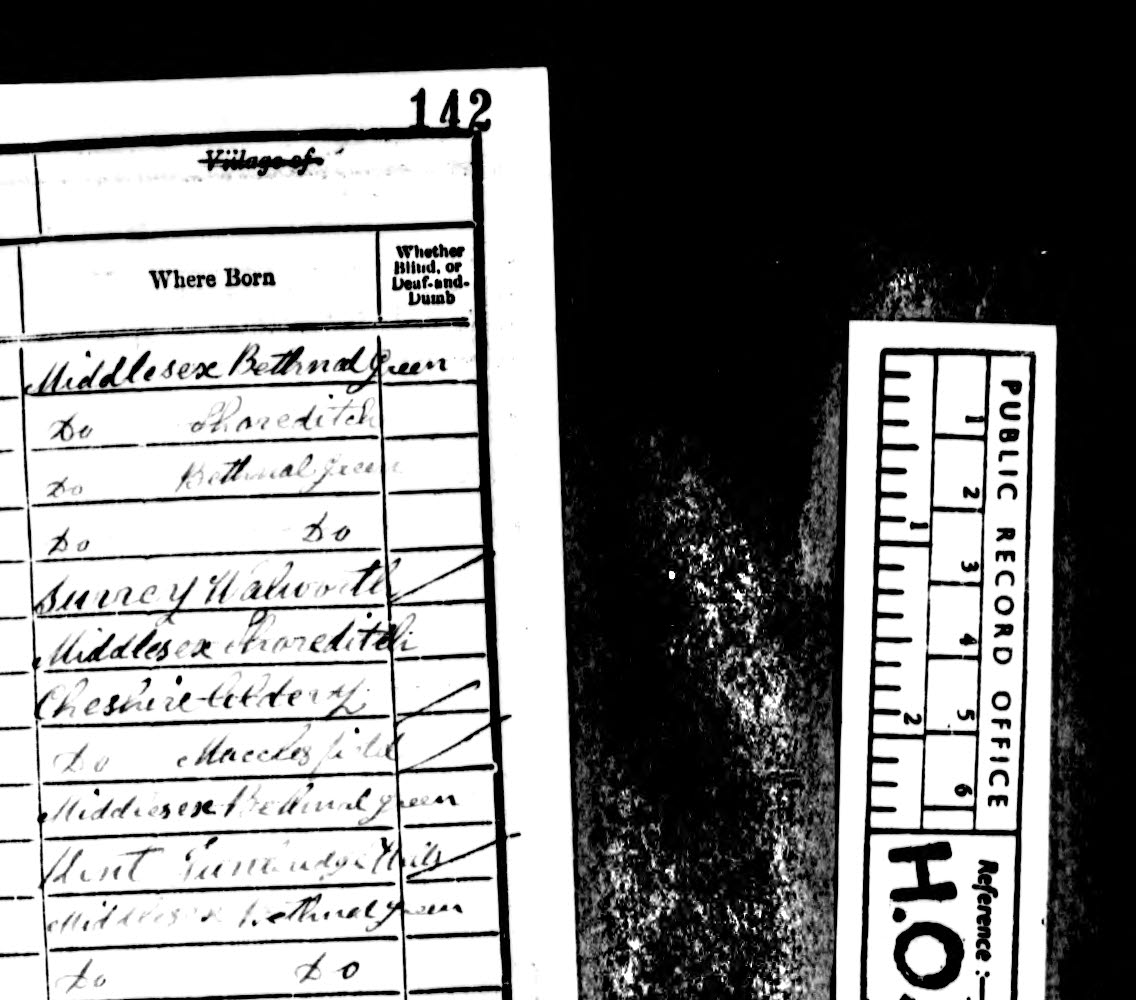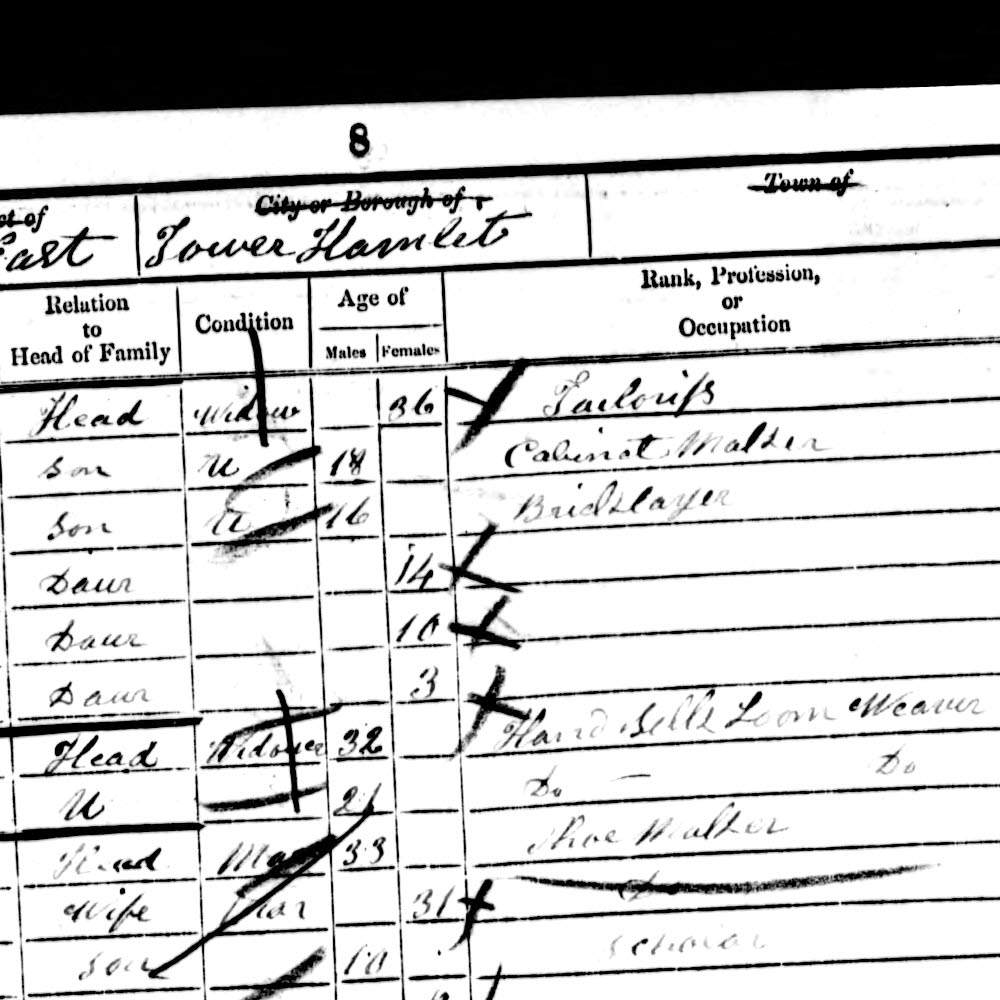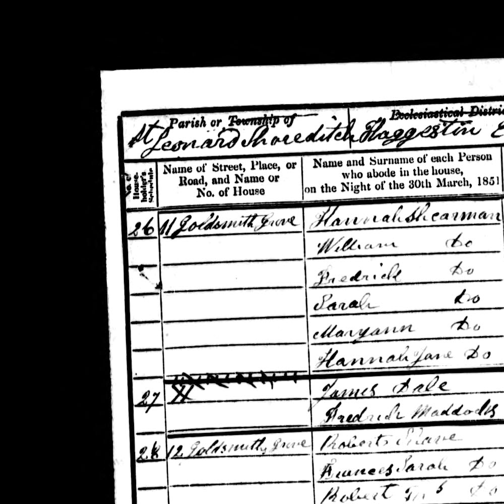 | Hannah Shearman | Head | widow | 36 | Tailoress | Bethnal Green, Middx |