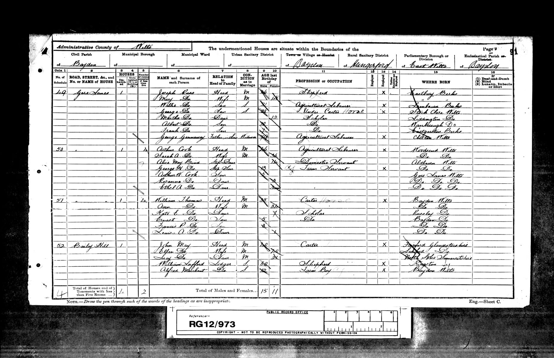 | Arthur Cook | 46 | Head | Marr | Agricultural Labourer | Woodsend (maybe Worldsend?) Wilts | |