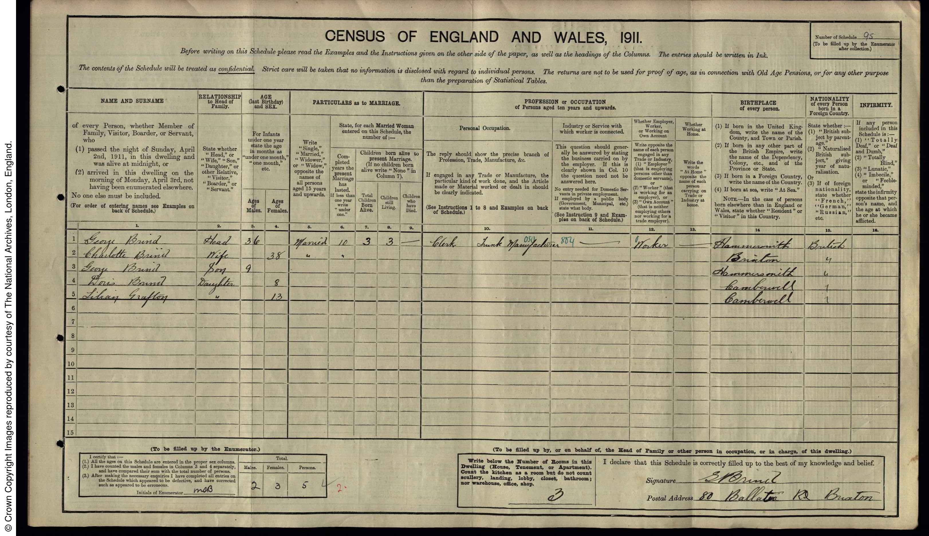 | Charlotte Brind | F | wife | 38 | married | Brixton | |
