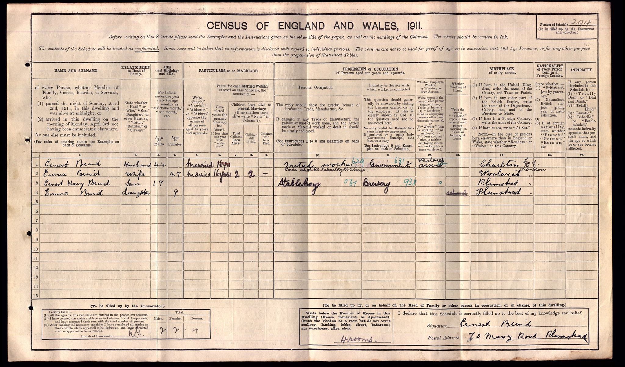 | Ernest Brind | M | Husband | 44 | Married | Metal worker/ government Woolwich Arsenal | Charlton | Plumstead |