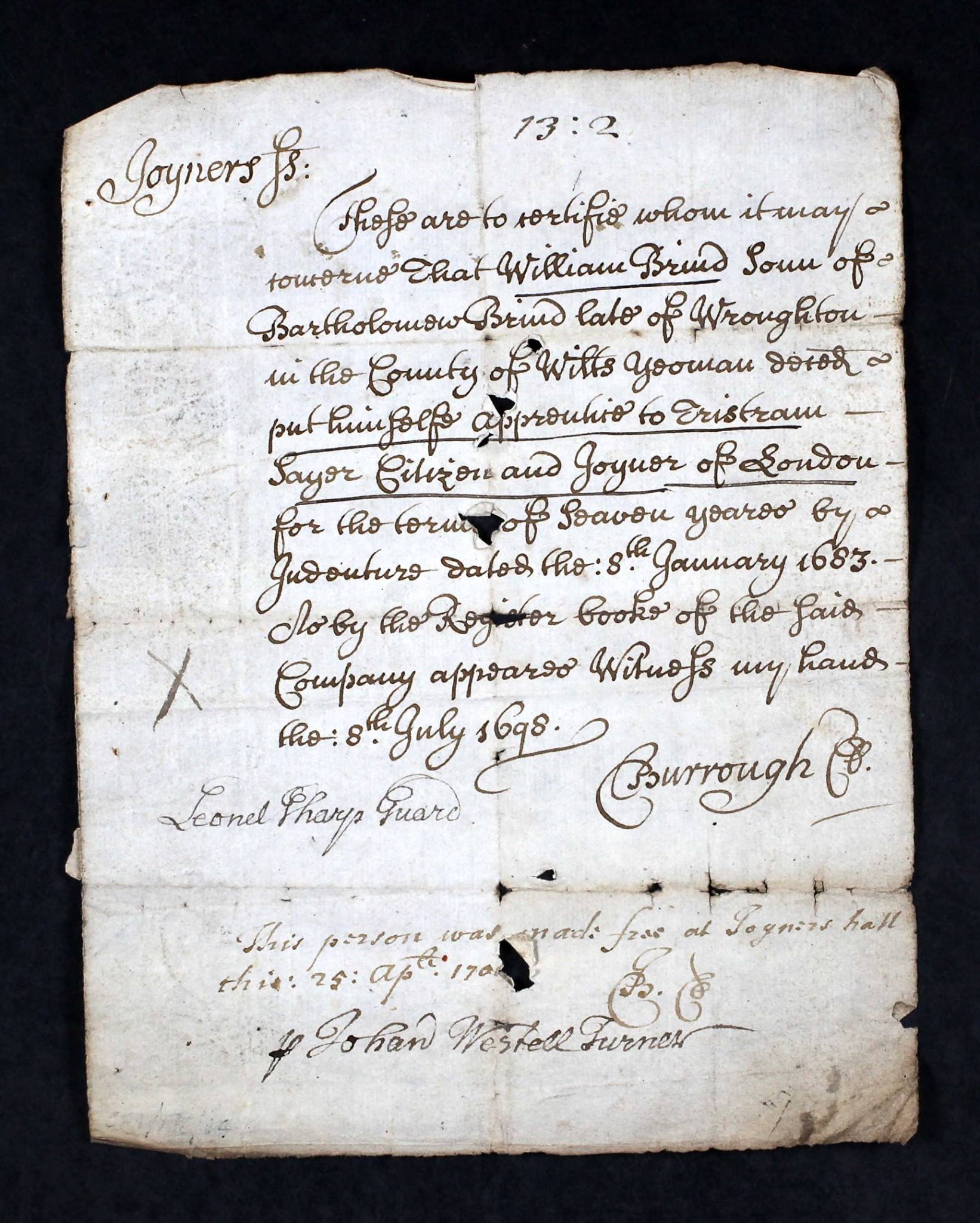 These are to certifie whom it may concerne that William Brind Sonn of Bartholomew Brind late of Wroughton in the County of Wilts yeoman decd. put himself apprentice to Tristram Sayer Citizen and Joyner of London for the term of Seaven yeares by Indenture dated the: 8th January 1683. So by the Register books of the said company appeares Witness my hand the: 8th July 1698 Leonel Sharys Guard Burrough Co This person was made free at Joyners hall this: 25: Apl 170? Johan Westell Turner | ||||