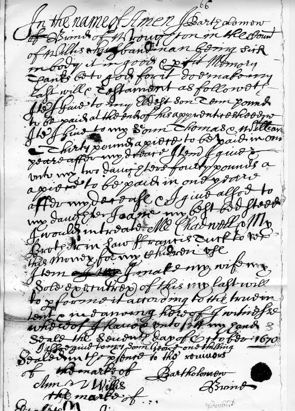 Brind of Wroughton in the County of Wilts husbandman being sick in body yet in good ??? Memory thanks be to god for it do so make my last will & testament as followeth ??? Give to my Eldest Tenn? pound to be paid at the end of his apprenticeship ??? I Give to my sonn Thomas & William thirty pounds a piece to be paid in one years after my decease I ???? I give & unto my two daughters fourty pounds a ???? to be paid in one years after my decease & I give also to my daughter Joan ?? my best bedstead I would ????????????????????? My brother in law Francis Tuck to ??? His memory for my children life ????????? I make my wife my sole exucutrix of this my last will to dispose it according to the ??? ????????? ??? I hand unto unto ??? ??? the second day of October 1670 I also give to my sonn George? one shilling Bartholomew to the ??? the mark of Bartholomew Brind Ann Willis the mark of | ![]() | |||