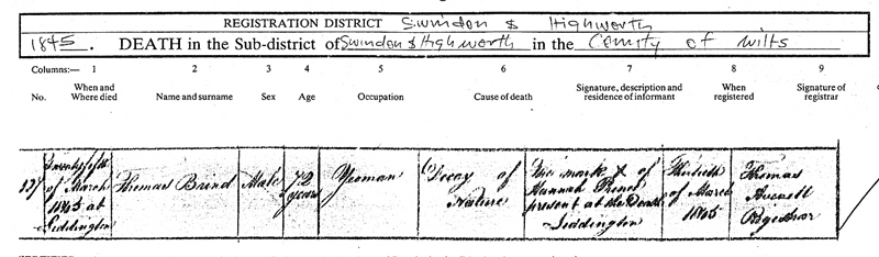 | Certified copy of an entry of DEATH | Registration district | Swindon & Highworth | 1845 DEATH in the Sub-district of Swindon & Highworth in the County of Wilts |