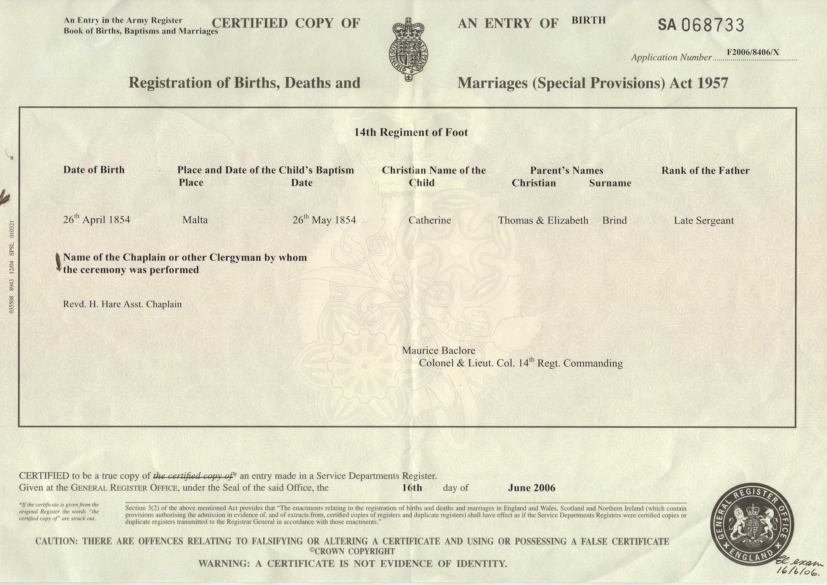 | 26th April 1854 | Malta | 26th May 1854 | Catherine | Thomas & Elizabeth | Brind | Late Sergeant | Revd H Hare, Asst. Chaplain | Maurice Baclore, Colonel & Lieut. Col 14th Regt Commanding | / / / / / |