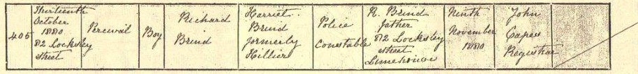 Police Constable | R Brind father 82 Locksley Street, Limehouse |
