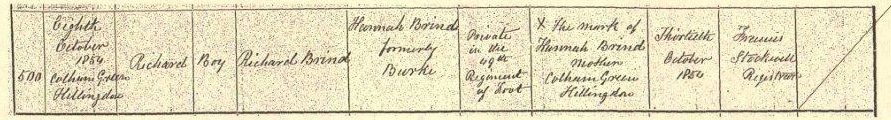 Private in the Light Regiment of Foot | X the mark of father Hannah Brind mother Colham Green, Hillingdon |
