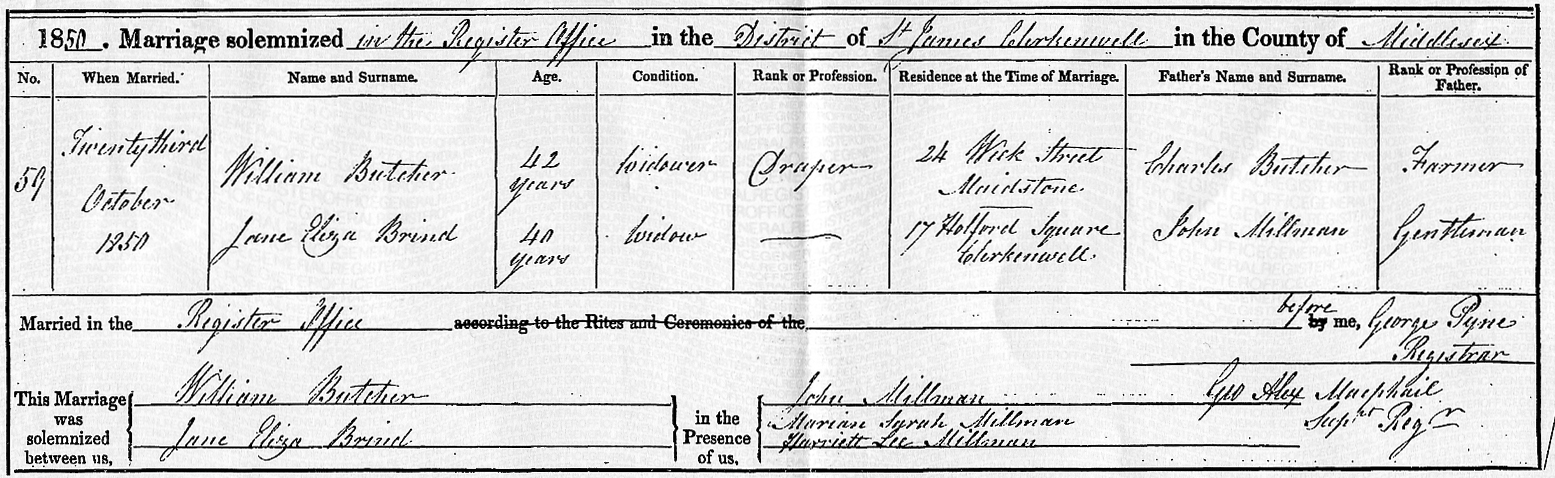 | William Butcher | = Oct 23, 1850. | Jane Eliza (Brind) | |