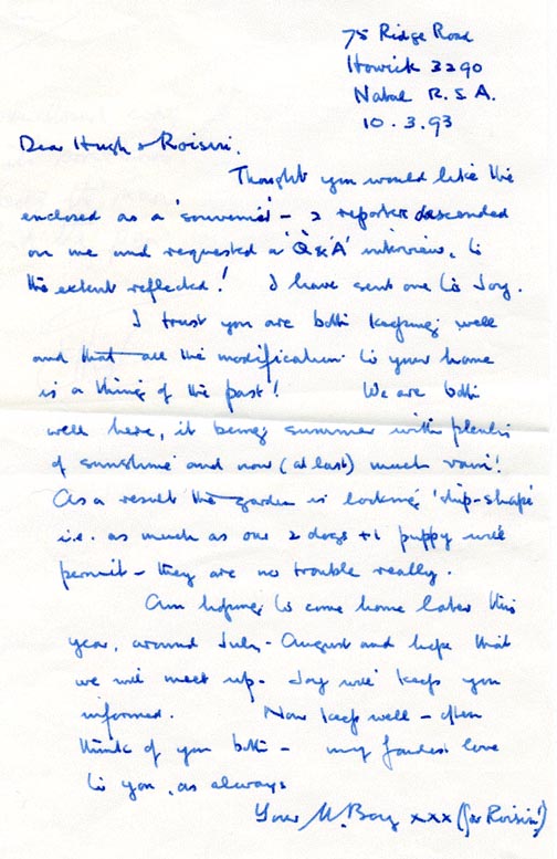 ![]() | 75 Ridge Road Howick 3290 Natal R.S.A. 10.3.93 Dear Hugh and Roisin Thought you would like the enclosed as a souvenir - 2 reporters descended on me and requested a Q& A interview to the extent reflected! I have sent one to Joy. I trust you are both keeping well and that all the modification to your home is a thing of the past. We are both well here it being summer with plenty of sunshine and now (at last) much rain! As a result the garden is looking ship shape i.e as much as our 2 dogs and 1 puppy will permit - they are no trouble really. Am hoping to come home later this year, around July-August and hope that we will meet up. Joy will keep you informed. Now keep well - often think of you both my fondest love to you, as always Your M Boy xxx (for Roisin) |