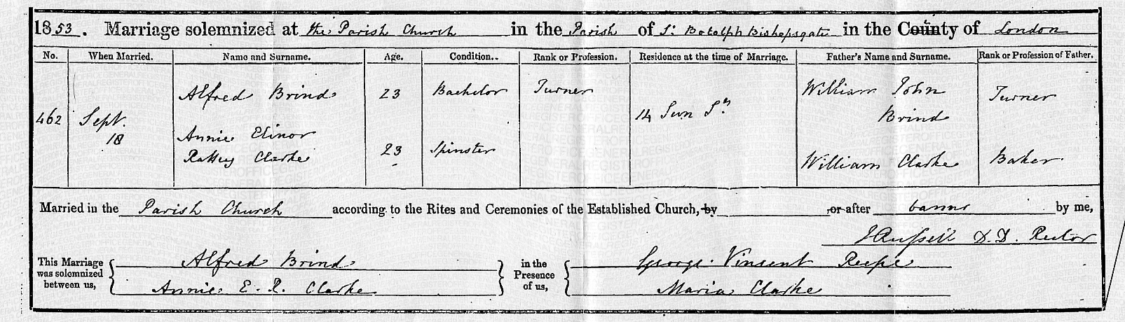 | 1853 Marriage solemnized at the Parish Church in the Parish of St Botolph Bishopsgate in the County of London |