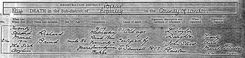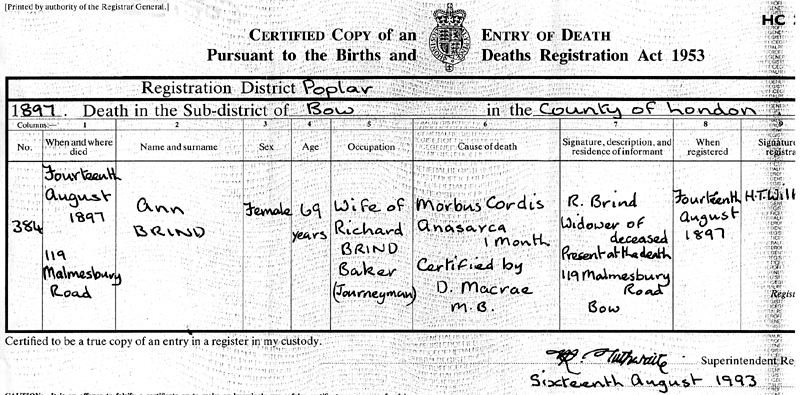 R. Brind Widower of deceased present at the death 119 Malmesbury Road Bow |
