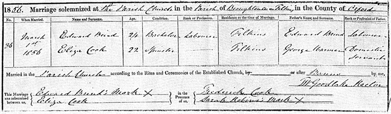 | 36 | March 1st 1856 | Edward Brind | 24 | Bachelor | Labourer | Filkins | Edward Brind | Labourer |