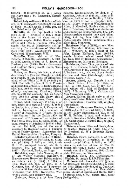 | Brind, lady.- Eleanor E. L. dau. of late rev. H. T. Burne of Grittleton, Wilts and of Bath; m 1878 as his 5 wife, gen. sir Jas Brind G.C.B. (d. 1888). | ||