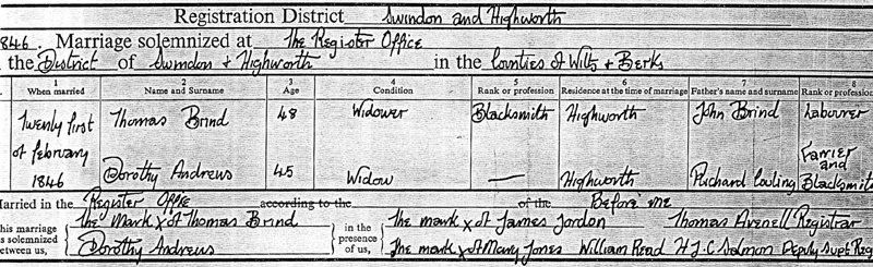 | ??? | Twenty first of February 1846 | Thomas Brind | 48 | Widower | Blacksmith | Highworth | John Brind | Labourer |