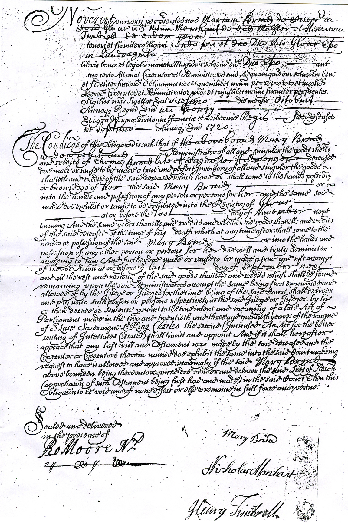 The Condicion of this Obligacion is such that if the above bound Mary Brind widow who was Administrator of all and singular the goods challs (presumably chattells) credits of Thomas Brind late of Cirencester(?) Ffellmonger deceased do make or saufer to be made a true and perfect Inventory of all and singular goods chattells and credits of the said deceased which have or shall come to the hands possession or knowledge of her the said Mary Brind----- or into the hands and possession of any person or persons for her and the same soe inad(?) deceased exhibit or cause to be exhibited into the Registry of Glam----at or or before the last---- day of November next ensuing