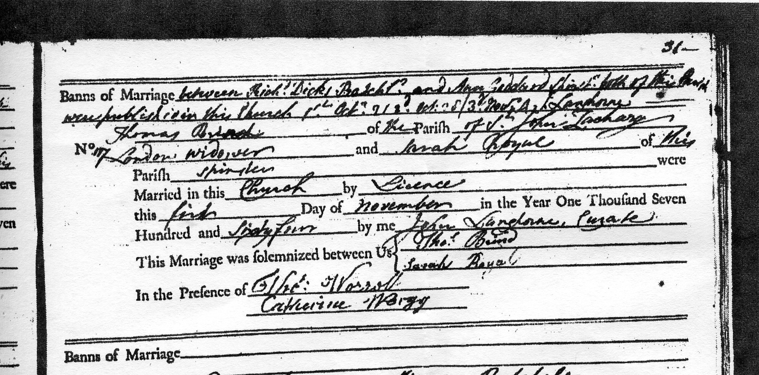 | Thomas | = September 21, 1746, St John Zachery, London | Abigail Ruffin | = November 1, 1764, St John Zachary (Islington), London | Sarah (Royal) |