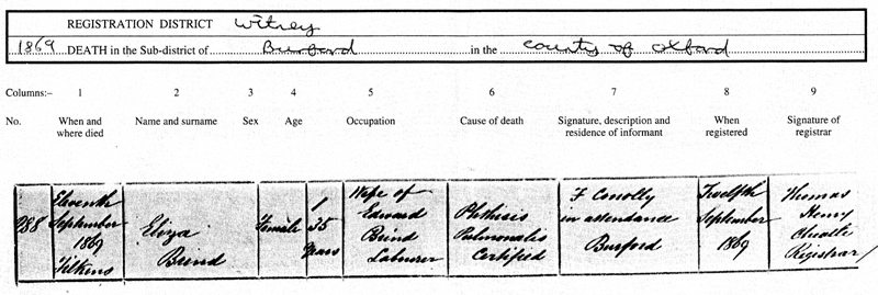 | Certified copy of an entry of DEATH | Registration district | Witney | 1869 DEATH in the Sub-district of Burford in the County of Oxford |
