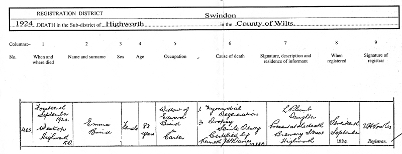 | Certified copy of an entry of DEATH | Registration district | Swindon | 1924 DEATH in the Sub-district of Highworth in the County of Wilts |