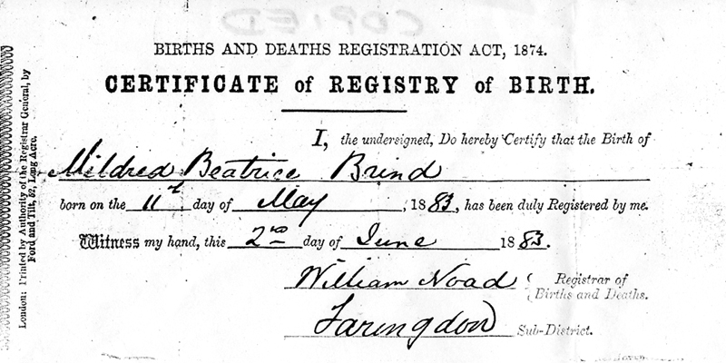 | Mildred Beatrice Brind | 21 | Spinster | Highworth | Edward Brind | Labourer |