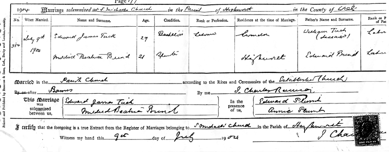 | 354 | July 9th 1904 | Edward James Tuck | 29 | Bachelor | Labourer | Lewden (?hard to read) |