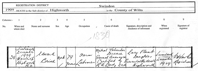 | Certified copy of an entry of DEATH | Registration district | Swindon | 1909 DEATH in the Sub-district of Highworth in the County of Wilts |