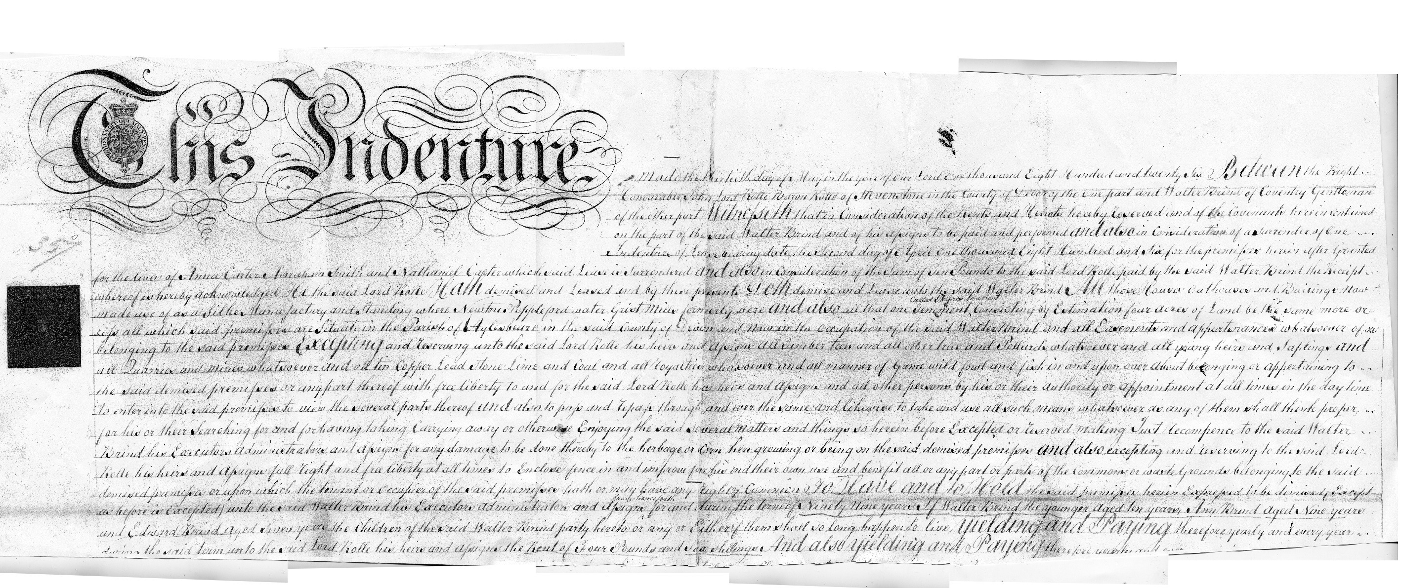 | SILK MILL CDE 21216-21228 INDENTURE dated 22 June 1774 Between Joseph Lug, cabinet maker of Newton Popplefordand William Heans of East Budleigh, yeoman of Close calledPillory Close ¾ acre. In possession of James Stadding,tenant. Held for remainder of term of 1000 years. PreviousIndenture dated 16 June 1770 to James Stadding ofSidmouth. INDENTURE dated 30 May 1824 Between John Hatse of Musbury & Walter Brind ofCoventry, silk manufacturer, of triangular field betweenNewton Poppleford Bridge & the Mill Weir, known as LittleMeadow late in occupation of Charles Pile, tenant; Lease forone year. INDENTURE dated 30th.May 1826 (see below/ click this link) Between John Lord Rolle and Walter Brind in considerationof surrender of Lease dated 2nd.April 1806 now leases "ALLthose houses,outhouses and buildings now made use of as aSilk Manufactory and standing where Newton PopplefordWater Grist Mills formerly were and all that tenementcalled "Paynes Tenement" of 4 acres Rent £4.6/-pa ChiefRent 14/-pa Heriot £20 Fine on Surrender £10 on the livesof Walter Brind jnr. age 10, Ann Brind 9, Edward 7, for 99years. (No.21) ASSIGNMENT OF LEASE dated 28th April 1827 As security for Banking Account to Messrs. James Beck &William Prime, City Bankers, Coventry. ASSIGNMENT OF LEASE dated 19th. February 1831 To Moore Elliott, Silk Throwster. (This is the sale from Brind to Elliott and Elliott becomes liable to Beck & Prime for thedebt) INDENTURE dated 28th. September 1836 Transfer of lease from William Moore Elliott of Pentonvilleto his son Henry Elliott of Newton Poppleford. |