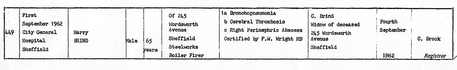 Harry Brind | male | 65 years | Steelworks Boiler Firer Of 245 Wordsworth Avenue |