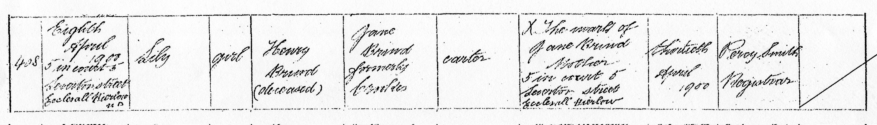 | Lily Brind | 24 | Spinster | -- | 17 Dutch St | Henry Albert Brind (deceased) | Carter |
