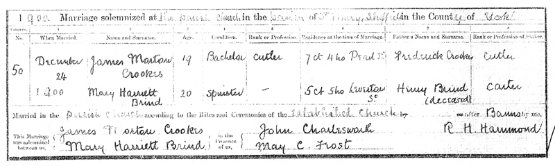 | 1900 Marriage solemnized at the parish church in the Parish of St Mary, Sheffield in the County of Yorks |