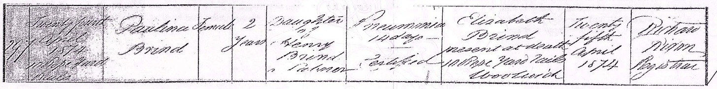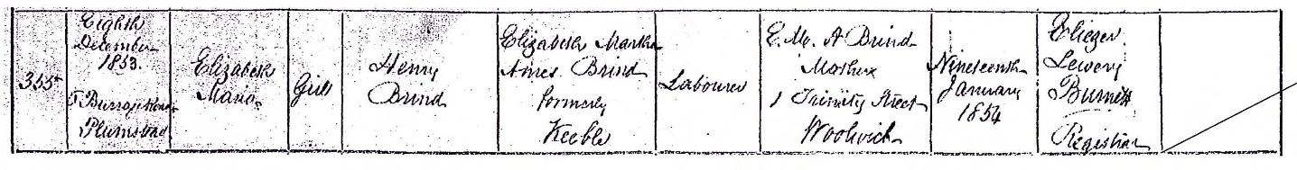 Elizabeth Brind present at the death 10 Rope Yard Rails, Woolwich |