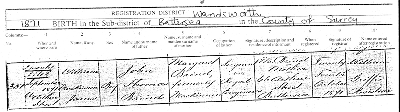 | Registration district of Wandsworth 1871 BIRTH in the sub-district of Battersea in the County of Surrey |