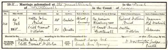 | It is the usual practice to enter the fact that a father has died (if he has) by using the word deceased. For some reason this certificate does not show that Richard William Brind is deceased, even though he died many years before this marriage. |