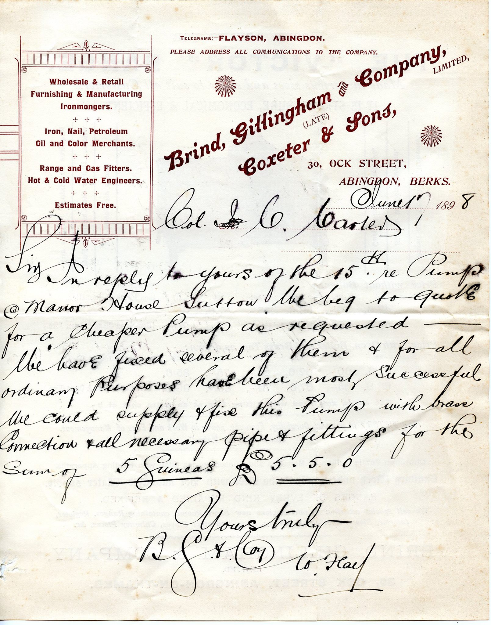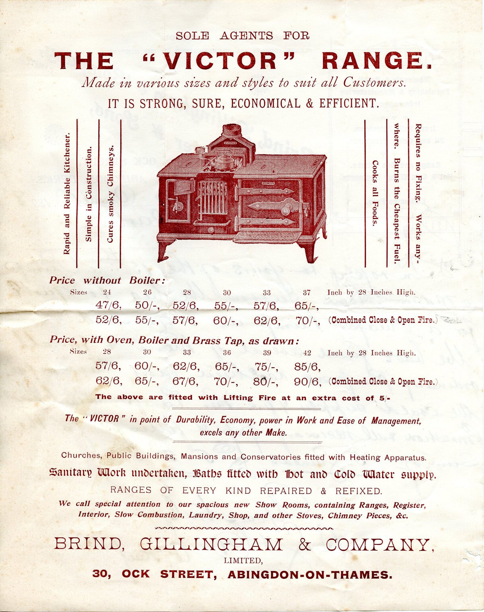 Hello Jonathan, I hope you're well. I saw your mention of the above on the Facebook group yesterday. I came across a couple of reference to this company in a few of my Abingdon local history books. I don't know if you have any of this already from anyone else, but in case it's helpful, this is what I found in the books: From "Ock Street Remembered", published by the Ock Street Heritage Group Entry for Beadle's Hardware Store, 30 Ock Street: "In 1919, Bertram Beadle from Sussex, who had been wounded in WW1, applied successfully for a job as an assistant at the Brind, Gillingham hardware store at 30 Ock Street. A hardware store had originally been opened in these premises by the Coxeter family in 1836. In 1898, Coxeters sold out to two former employees, Mr Brind and Mr Gillingham, who also started a wholesale department in the location of the old British School directly opposite. A serious fire in 1938 destroyed all but the front section of the premises and because of the war commencing soon after, only primitive replacements were allowed to be built. The shop was sold in 1939 to Ilcos electrical retailers in Oxford. They closed the business and in 1951 sold the shop to Mr Beadle". It then goes on to talk about the history of the shop once Mr Beadle owned it. So Mr Brind - alas no first name mentioned and Mr Gillingham had two premises in Ock Street, the above mentioned number 30 and another premises opposite. there's no photo of that in there. There is a small picture in the book of Mr Brind and Mr Gillingham at a trade show. It is unfortunately undated. Mr Brind is on the right and Mr Gillingham on the left. I've attached pictures of the premises (taken from More of Abingdon Past and Present) and Mr Brind (from the Ock Street book). The picture showing the garage Merityre, is from 2000 but it looks exactly the same today. I'm not really sure which Mr Brind it is - if anything else turns up, I'll let you know. It's a shame no first name is mentioned in the books I have! The Mr Brind picture is very small so I can't get a better image of it I'm afraid. Kind regards, Alyson This was probably Robert Whitehead Brind, an Abingdon based ironmonger in the 1901 census. Scroll down to see photos. |