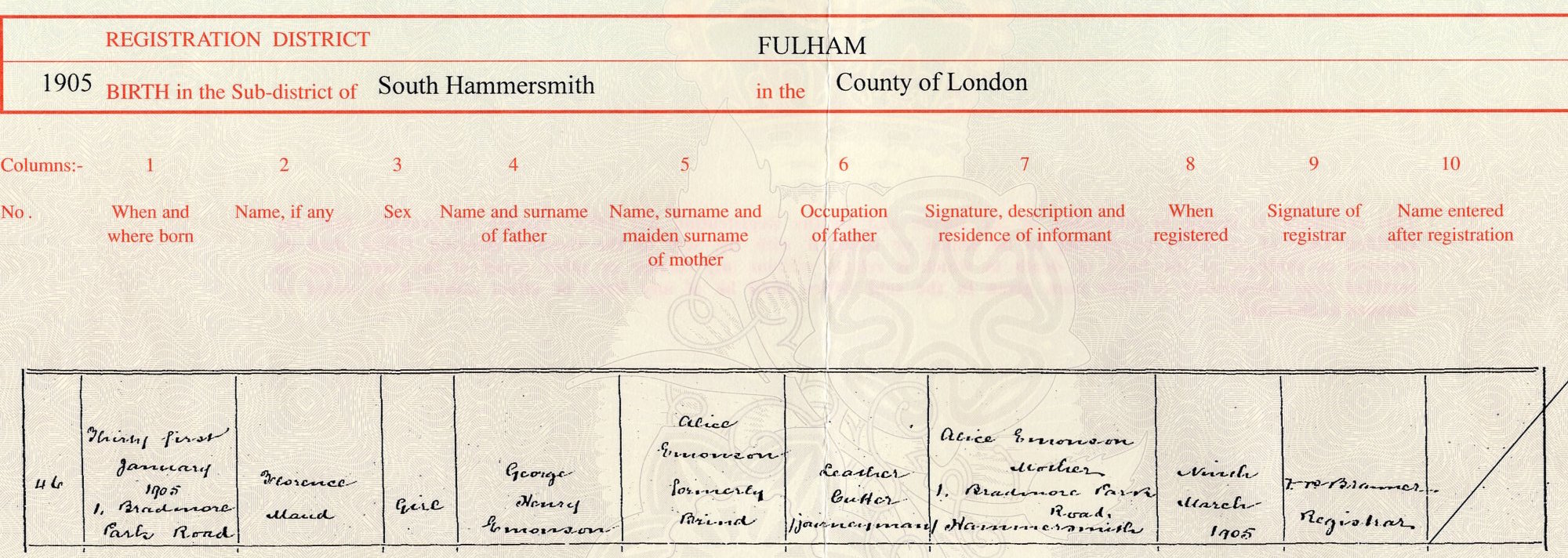 Florence Maud | Girl | George Henry Emonson | Alice Emonson formerly Brind | Leather cutter (journeyman) | Alice Emonson mother 1 Bradmore Park Road, Hammersmith |