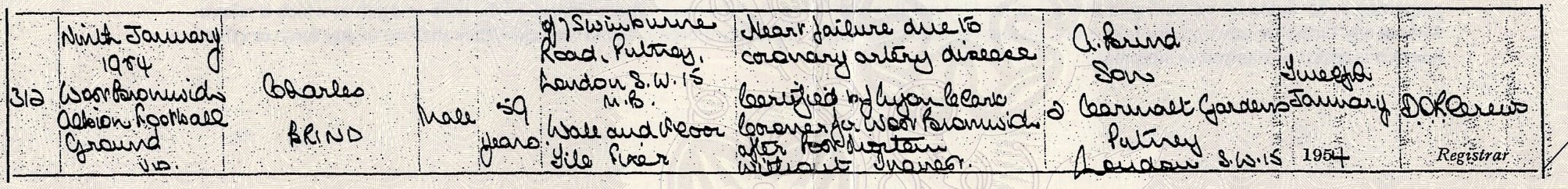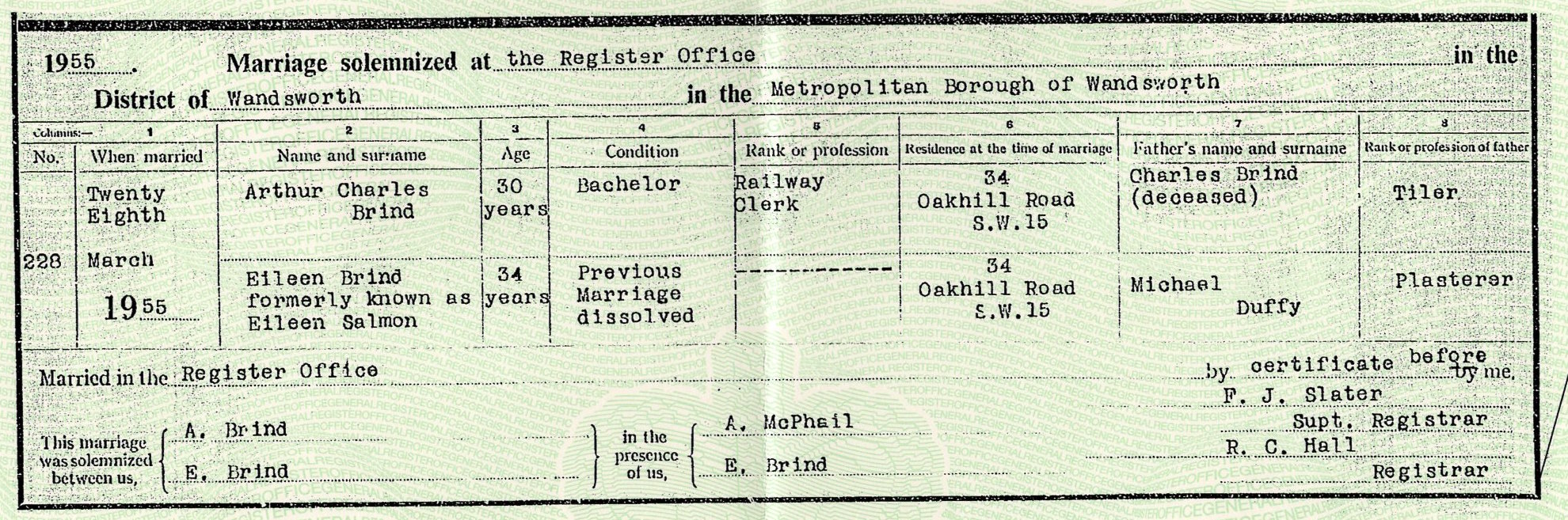 | 228 | 28 March 1955 | Arthur Charles Brind | 30 years | Bachelor | Railway clerk | 34 Oakhill Rd, SW15 | Charles Brind (deceased) | Tiler |