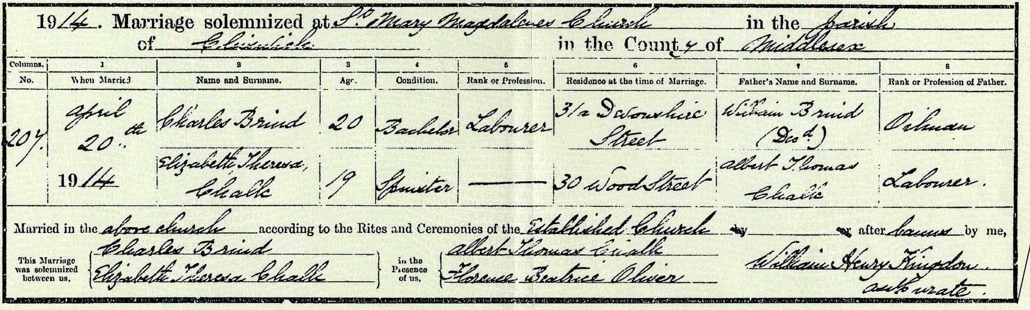 | 1914 Marriage solemnized at St Mary Magdalene Church in the parish of Chiswick in the County of Middlesex |