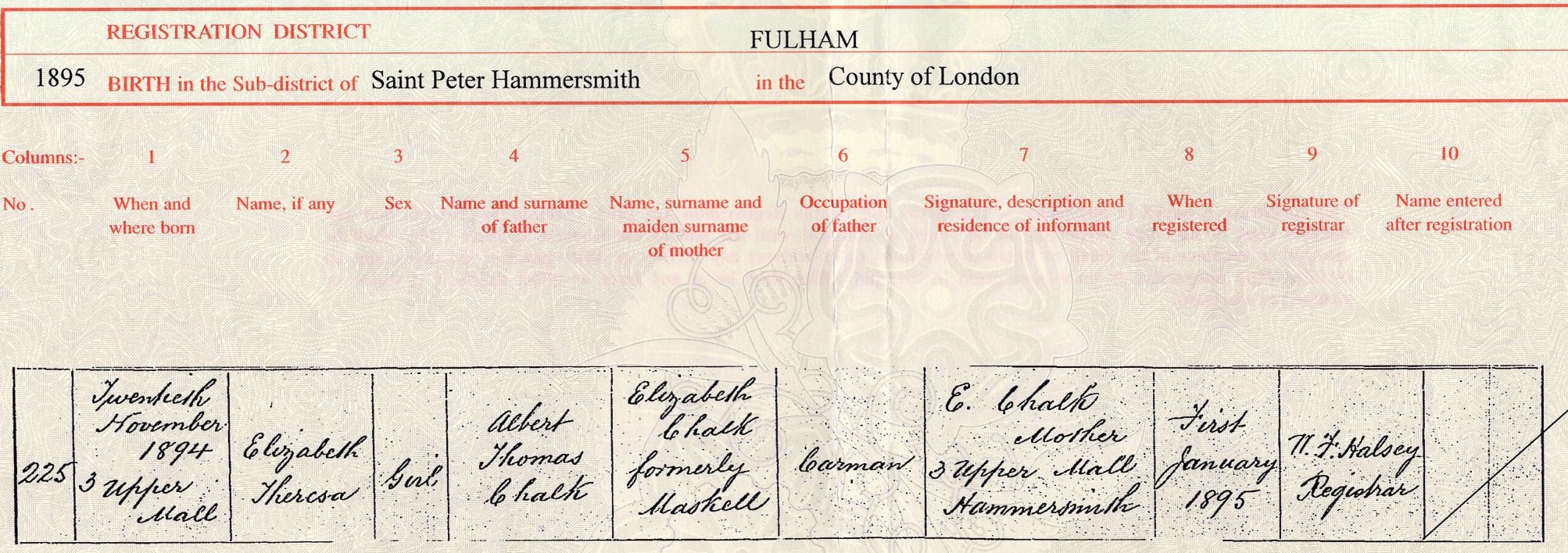 Elizabeth Theresa | Girl | Albert Thomas Chalk | Elizabeth Chalk formerly Maskell | Carman | E Chalk mother 3 Upper Mall, Hammersmith |