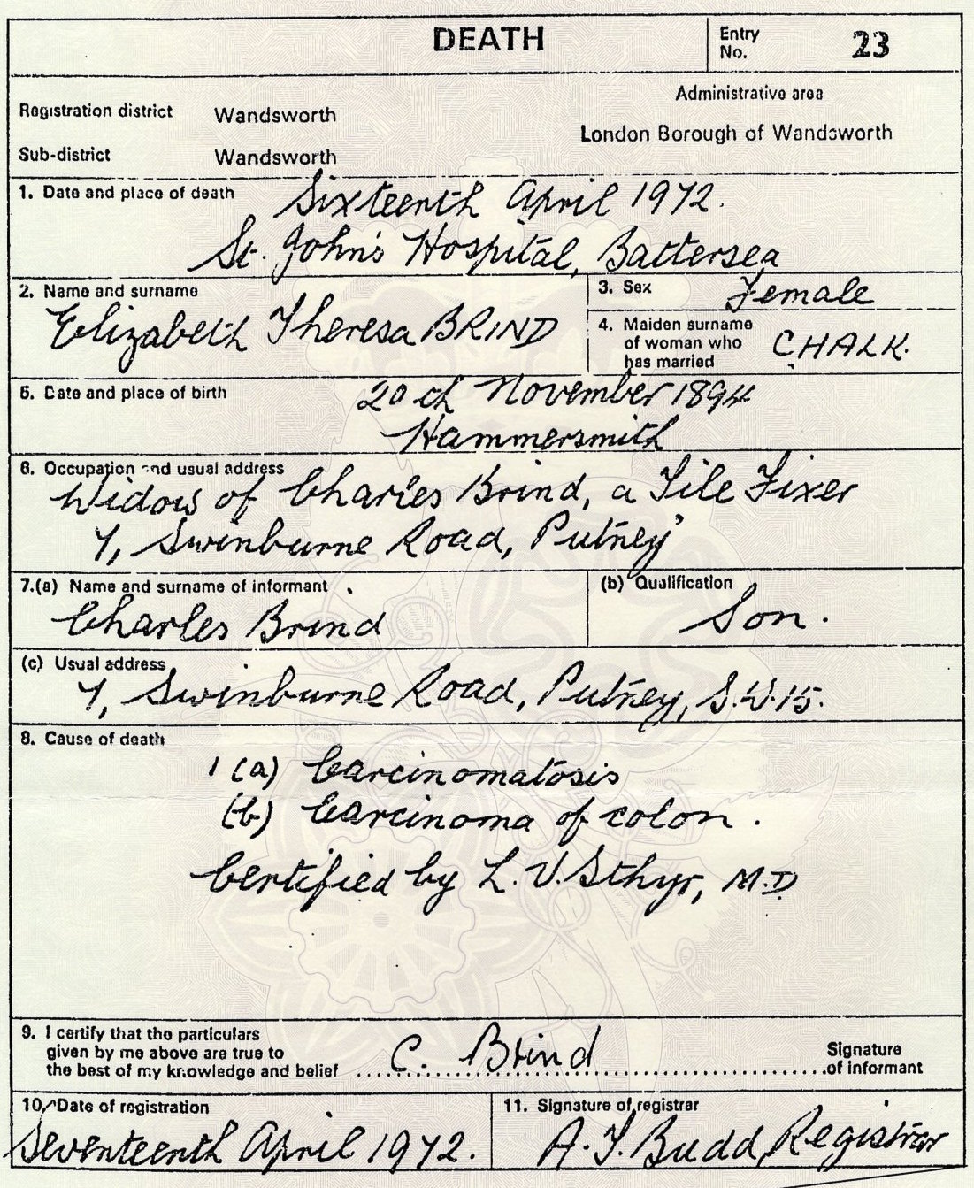 Elizbeth Theresa Brind (maiden surname Chalk) | Female | 20th Nov 1894 Hammersmith | Widow of Charles Brind a tile fixer of 7 Swinburne Rd, Putney | (a) Carcinomatosis (b) Carcinoma of colon Certified by L V Stythr MD | Charles Brind (son) |