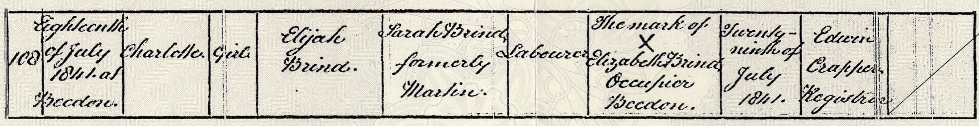 | 108 | Eighteenth of July 1841 at Speedon | Charlotte | Girl | Elijah Brind | Sarah Brind formerly Martin | Labourer | The mark of Elizabeth Brind Occupier Beedon | Twenty ninth of July 1841 | Edwin Crapper, Registrar | / / / / / |
